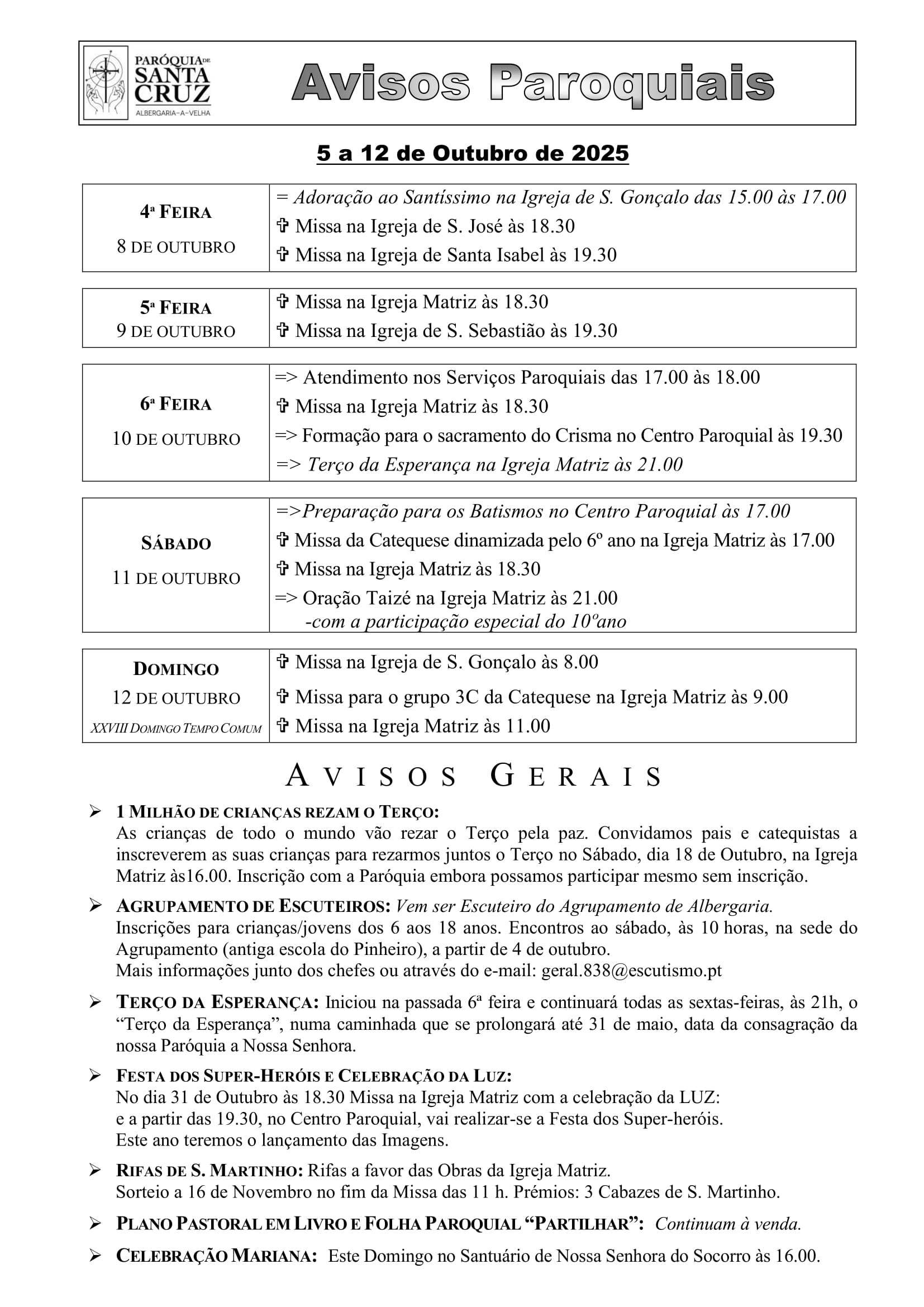 Avisos da semana de 28 Setembra a 5